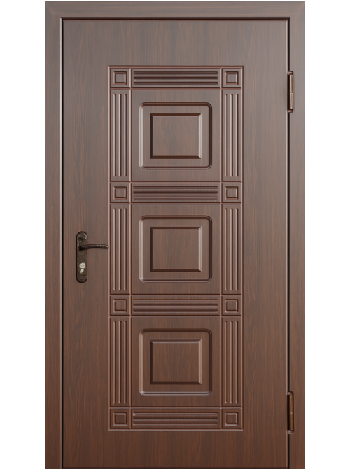 Металева конструкція зсередини надійно захищає оселю, а зовні — МДФ накладки у стриманому кольорі з фактурною поверхнею. Утеплення зберігає тепло, а надійний замок — ваш спокій.