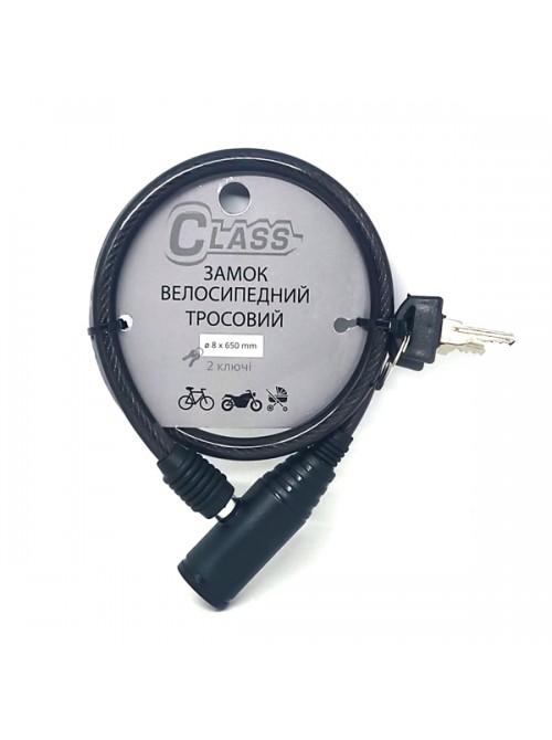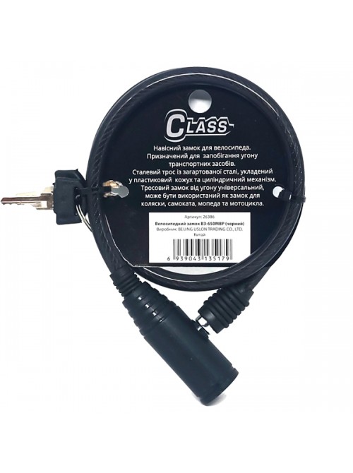 CLASS ВЗ-650 MBP – це надійний навісний замок для велосипеда. За конструкцією це трос довжиною 65 см з товщиною 8 мм. Виготовлений із загартованої сталі. Для того, щоб не пошкодити Ваш велосипед та захистити його від подряпин, він спеціально покритий ПВХ чохлом. Секретна частина замка знаходиться у ПВХ корпусі. Замок керується англійським ключем. Закриття відбувається при вийнятому ключі. В комплекті їх 2 шт. Доволі компактні розміри дозволяють транспортувати замок на трубі під сідлом, на рулі чи у багажнику. Виробник рекомендує фіксувати велосипед через раму та заднє колесо до стовпа або бетонного поручня. Встановлення цього замка на велосипед легке і не вимагає особливих зусиль. В чорному кольорі стане відмінним аксесуаром на транспорті будь-яких відтінків. Крім того, його можна використовувати і для інших транспортних засобів, таких як коляски, самокати, мопеди та мотоцикли, за необхідності.