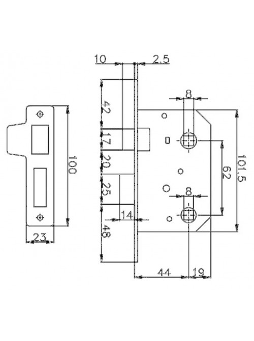 Розміри - 102 х 60,5 мм., торцева планка - 152 х 22 х 2,5 мм.