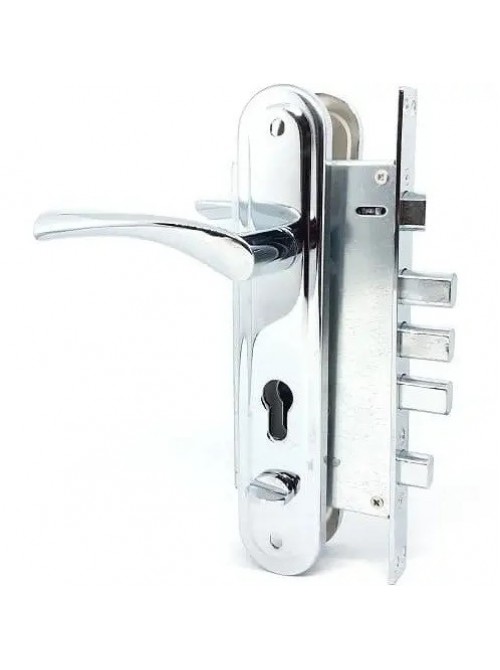 Цей комплект замку призначений для встановлення в металеві вхідні двері. Корпус можна встановити лише на лівосторонні двері. Комплект ручок зібраний таким чином, що зсередини приміщення можна закривати додатковим поворотником (нічна засувка). У комплектацію замку входить ручка та корпус замку.