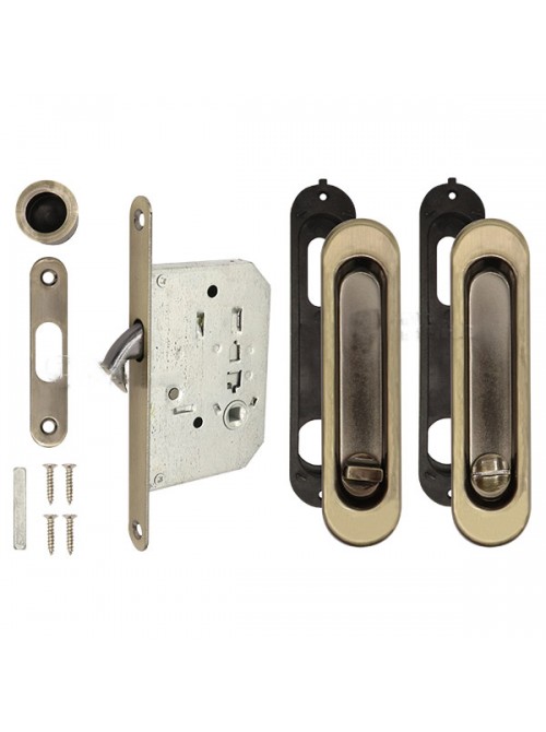 Дана модель - це комплект фурнітури, який спеціально призначений для врізки в двері, які змонтовані в розсувну систему. Включає в себе механізм замка. Для відкривання та фіксації полотна в закритому положенні служать ручки із воротком. Вони мають таку конструкцію, що не виступають за край дверей. Завдяки цьому не заважають їхньому повному закриванню. Для екстрених випадків вороток має проріз для відкривання із зовнішньої сторони. З дизайнерської точки зору дані ручки виділяються своїм мінімалізмом, тому не привертатимуть зайвої уваги. В бронзовому кольорі майже магічним чином довершать загальний образ приміщення в класичному чи модерновому стилі з присутністю дерева. Матеріал виготовлення - цинковий сплав. Завдяки цьому та інноваційній технології гальванічної обробки ручки зберігатимуть свій зовнішній вигляд протягом довгого часу. За допомогою цього комплекту можна закривати як два полотна між собою так і фіксувати одне полотно впритул до стіни.
