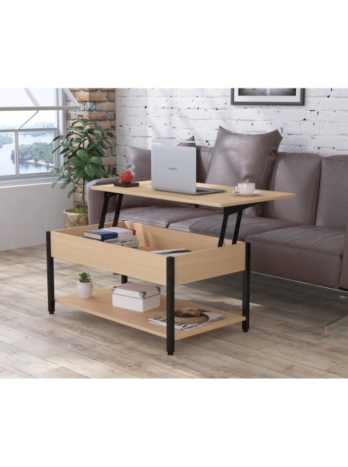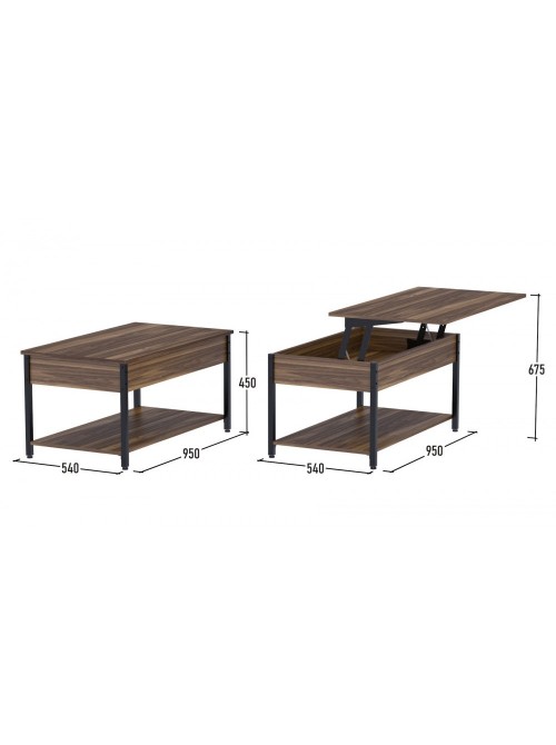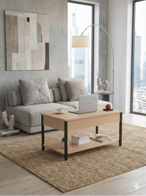 Журнальний столик L-5 — це універсальний і функціональний меблевий елемент, який адаптується під ваші потреби. Головна особливість — підйомна стільниця, що дозволяє перетворити столик у комфортне робоче місце або обідній стіл. Максимальна висота підйому — 675 мм, з стільницею, що витримує навантаження до 10 кг. Матеріали високої якості: стільниця — ДСП товщиною 16 мм, ніжки — труба 20×20 мм у чорному кольорі. Прямокутна форма (95×54 см), глибина 54 см, стандартна висота 45 см у складеному стані. Є також відкрита нижня полиця для зберігання книг, пледів або декору. Регульовані ніжки допоможуть вирівняти стіл на нерівній підлозі і захистити покриття. L-5 ідеальний для стилів лофт, мінімалізм, сучасний модерн, коли важлива не лише естетика, а й практичність. Якщо потрібно працювати з ноутбуком або споживати обід прямо з дивану — підйомний механізм дає таку можливість. Поверхні легко очищуються, металеві частини — стійкі до подряпин.