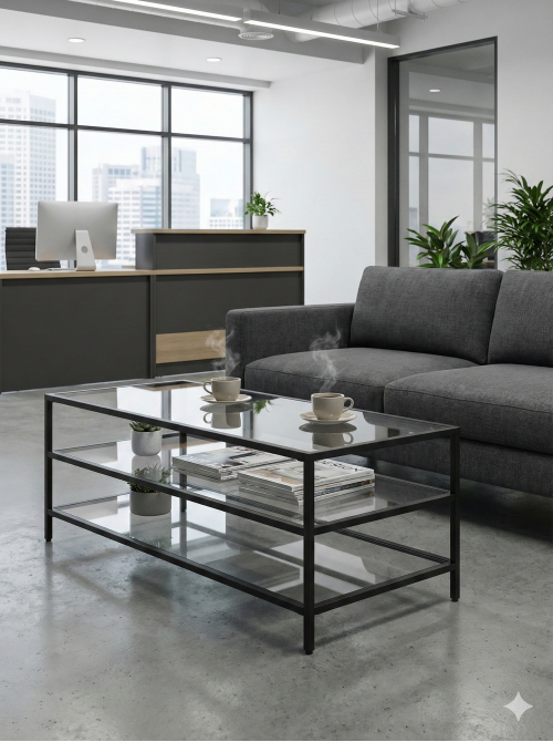 Журнальний столик Brehmer від виробника МСМ — чудове поєднання стильного дизайну та практичності. Розміри 116×50×43 см роблять модель просторою, але не громіздкою, ідеальною для вітальні, кабінету чи лаунж-зони. Модель оснащена прозорими скляними полицями товщиною 6 мм, які додають візуальної легкості і дозволяють зручно розміщувати книги, журнали чи декор. Металевий каркас із труби 20×20 мм забезпечує функціональність і витривалість. Чорний колір дасть змогу гармонійно вписати виріб в інтер’єр, підібравши тон до інших меблів або аксесуарів. Конструкція столика передбачає одну відкриту нижню полицю, що простягається до поверхні, і середню полицю, розташовану трохи нижче. Це створює багаторівневий дизайн і дозволяє ефективно використовувати простір: верхня полиця — для напоїв чи чашки кави, нижні — для зберігання речей.