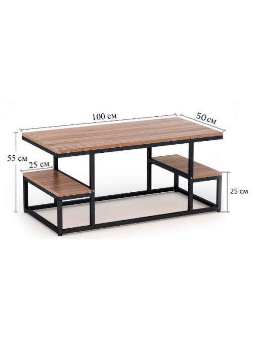 Висота столу становить 550 мм, що на 10 см вище стандартних моделей. Це робить його ідеальним для того, щоб зручно пити каву або працювати за ноутбуком, сидячи на дивані. Ніжки столу обладнані спеціальними флісовими підкладками. Ви можете сміливо пересувати стіл паркетом чи ламінатом, не боячись залишити подряпини. Обирайте колір стільниці під свій смак: від популярного Дуба Сонома чи Горіха до контрастних Білого та Чорного. Каркас із труби 20×20 мм з чорним порошковим покриттям гарантує довговічність, а ламінована ДСП легко очищується від забруднень.