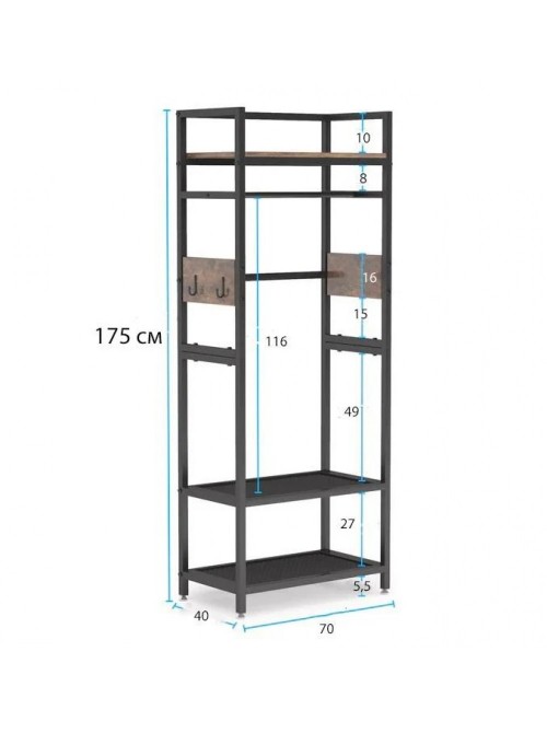 Вішалка-стійка для передпокою 175×70×40 см від виробника MSM — це практичне рішення для зберігання одягу та взуття у сучасному інтер’єрі. Модель поєднує металевий каркас і полички з ДСП, що забезпечує надійність, стиль та довговічність. Верхня полиця підходить для головних уборів, коробок або аксесуарів, центральна секція з гачками — для верхнього одягу, а дві нижні полиці зручні для взуття чи сумок. Завдяки компактним розмірам вішалка ідеально підійде для вузьких коридорів, квартир-студій, гостьових кімнат або офісних приміщень. Лаконічний дизайн у стилі лофт легко поєднується з тумбами, столами та стелажами MSM, створюючи єдину сучасну композицію. Вішалка проста в монтажі, має стійку конструкцію та регульовані ніжки, що дозволяють встановити її навіть на нерівній підлозі. Це функціональний і стильний елемент меблів, що допоможе підтримувати порядок і оптимізувати простір у вашому домі.