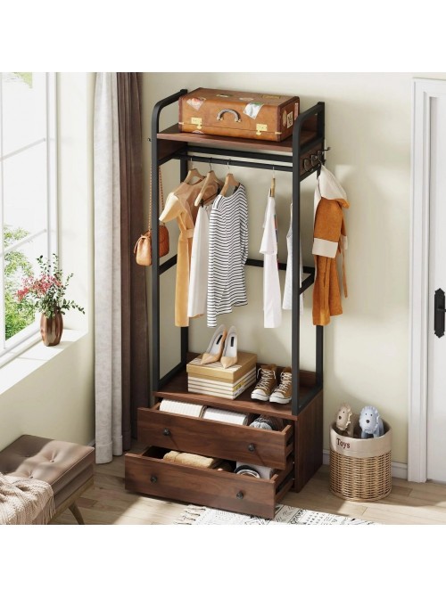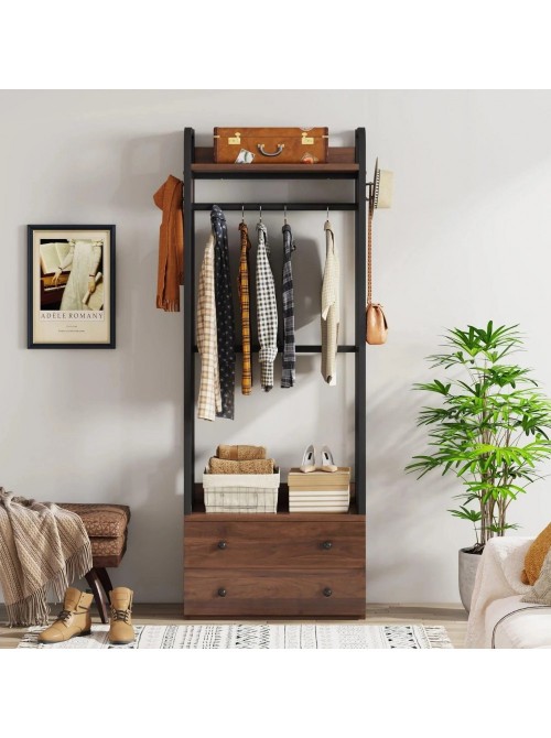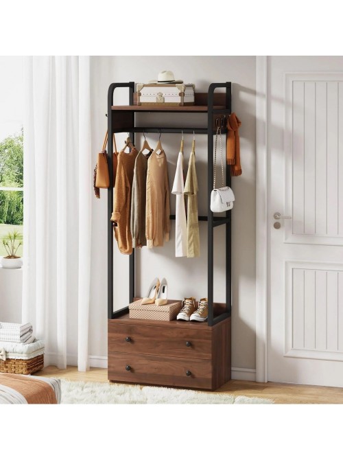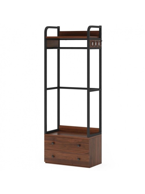 Вішалка для одягу з шухлядами від ТМ МСМ — це вишукане поєднання практичності та сучасного дизайну, яке чудово підходить для організації будь‑якого передпокою або вузького простору. Конструкція включає 2 висувні шухляди, 3 штанги для підвішування, 6 гачків для аксесуарів і відкриту полицю для сумок або взуття — усе компактно і структуровано. Міцна металева рама (20×40 мм) у поєднанні з ДСП (16–мм) забезпечує довговічність і стабільність. Висока (190 см), але вузька (70 см ширини та 40 см глибини) конструкція дозволяє максимально ефективно використати вертикальний простір. Доступна у кольорових рішеннях чорний , білий, дуб сонома, дуб родос , горіх. , ця вішалка додає сучасного лофтового характеру до будь‑якого інтер’єру.
